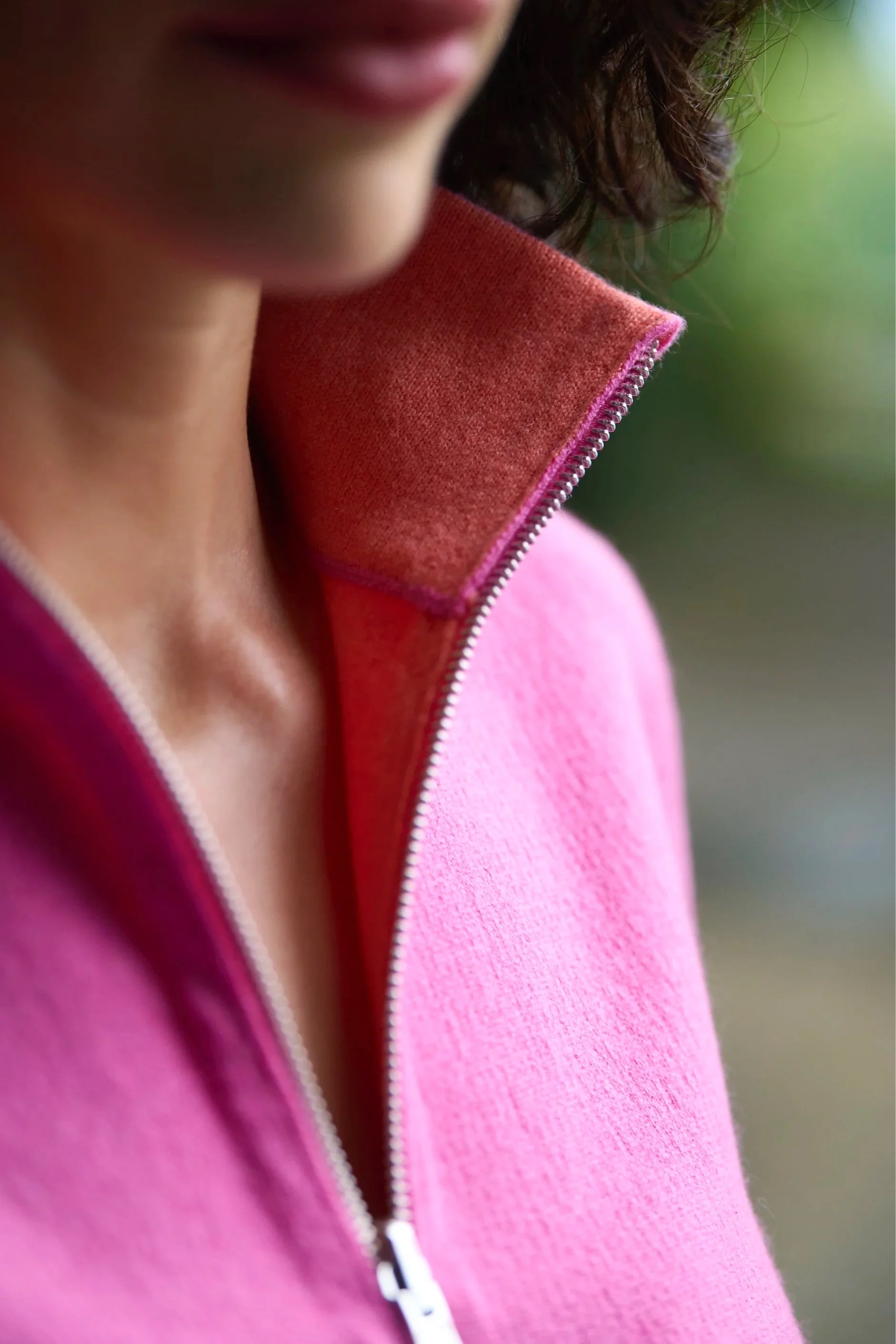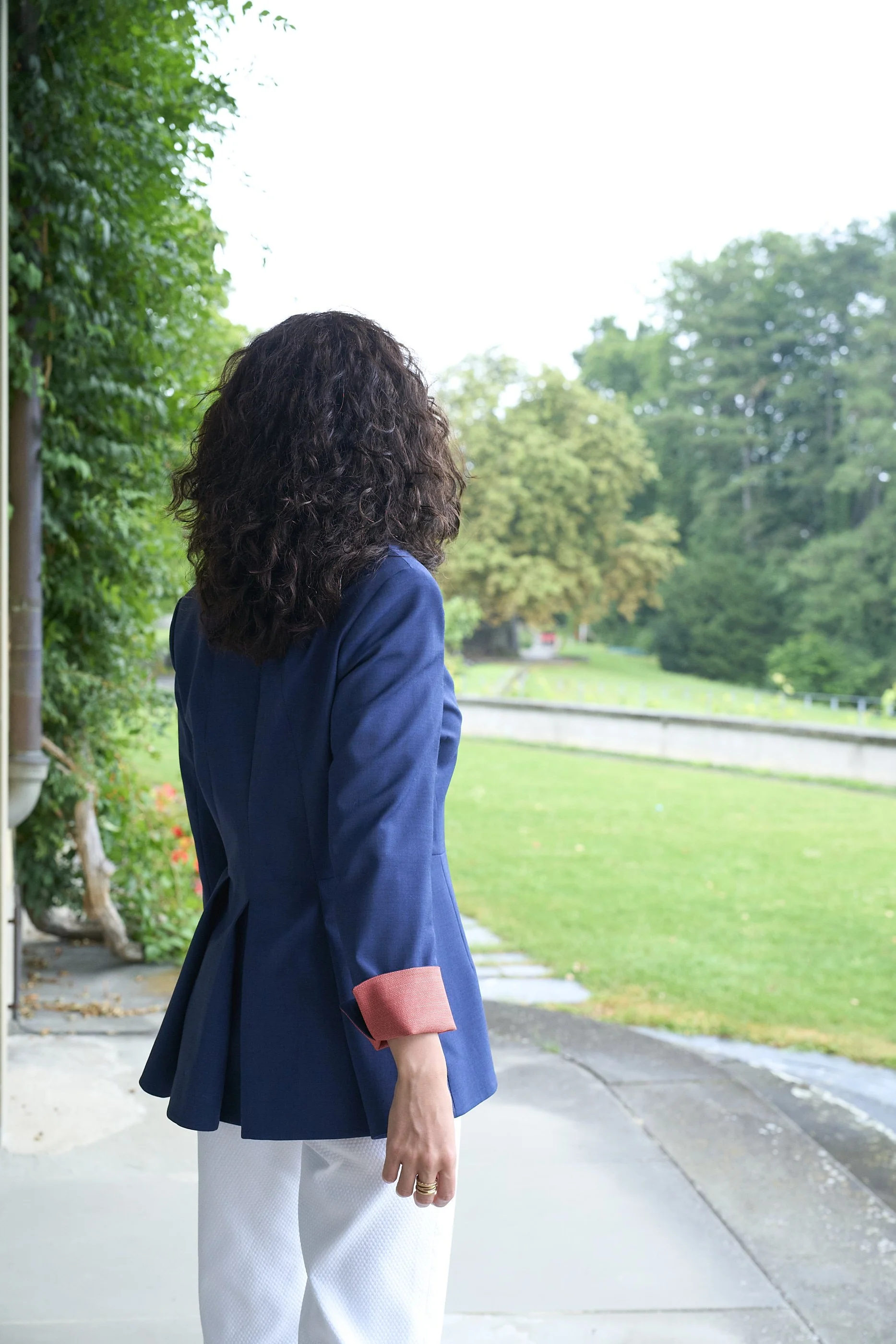 Navy silk and wool jacket, salmon detail with white pants with lace detail