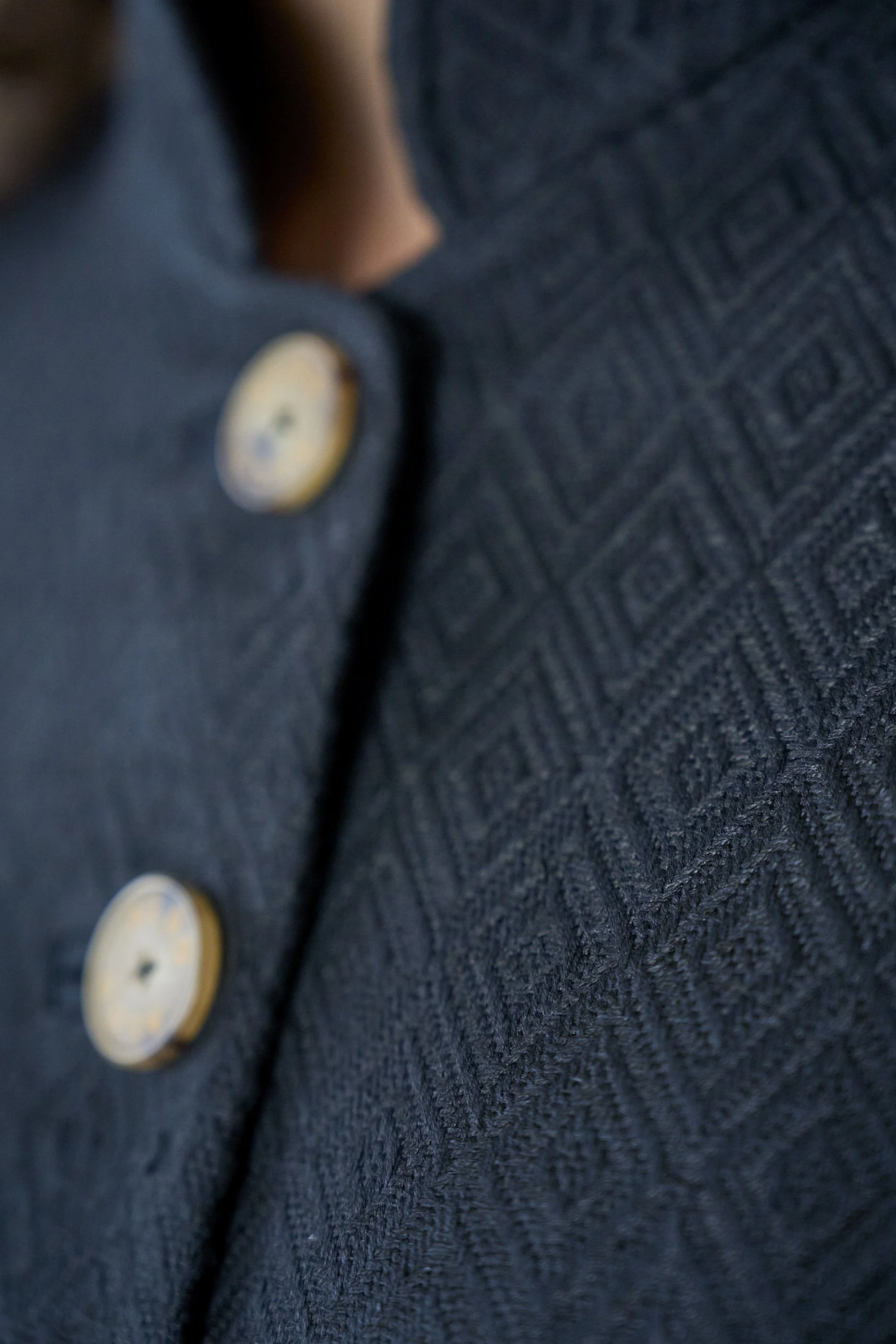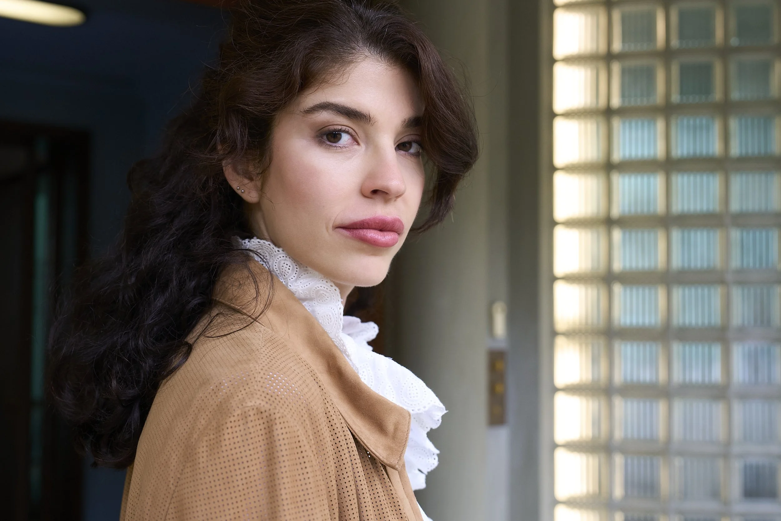Camel perforated jacket with white ruffle shirt