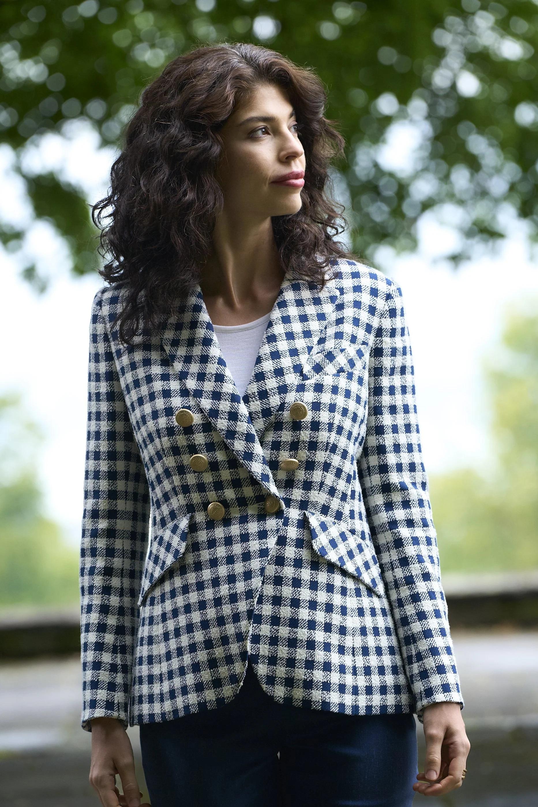 Navy & cream checked tweed jacket with white silk knit shell and navy shantung pants